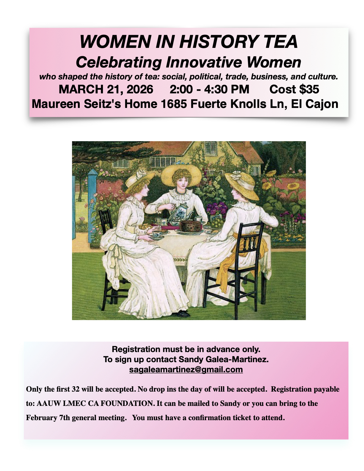 Our annual tea fundraiser this year will celebrate innovative women who shaped the history of tea: social, political, trade, business, and culture. It will be held on March 21, 2026, 2-4:30 p.m. at the home of Maureen Seitz, 1685 Fuerte Knolls Ln, El Cajon.